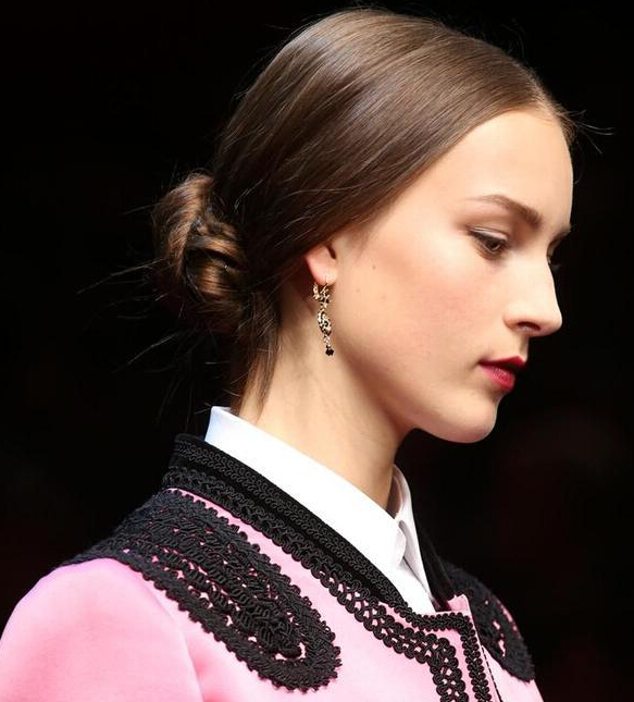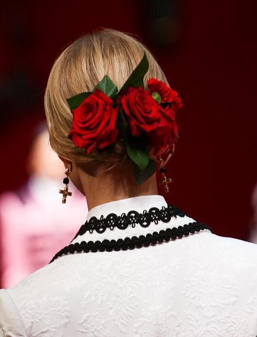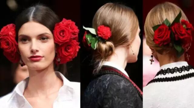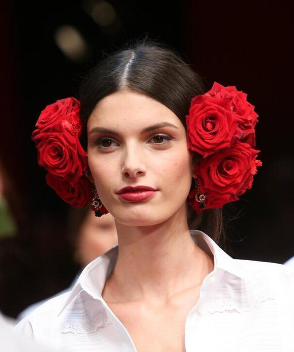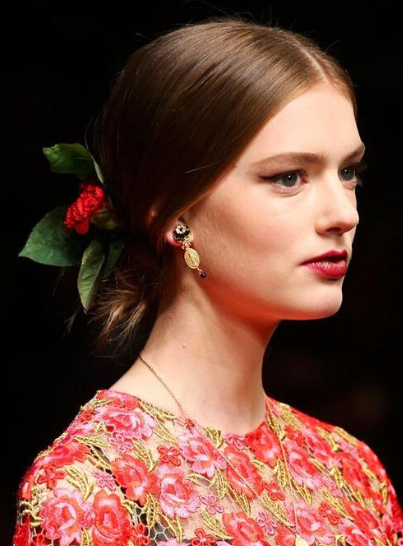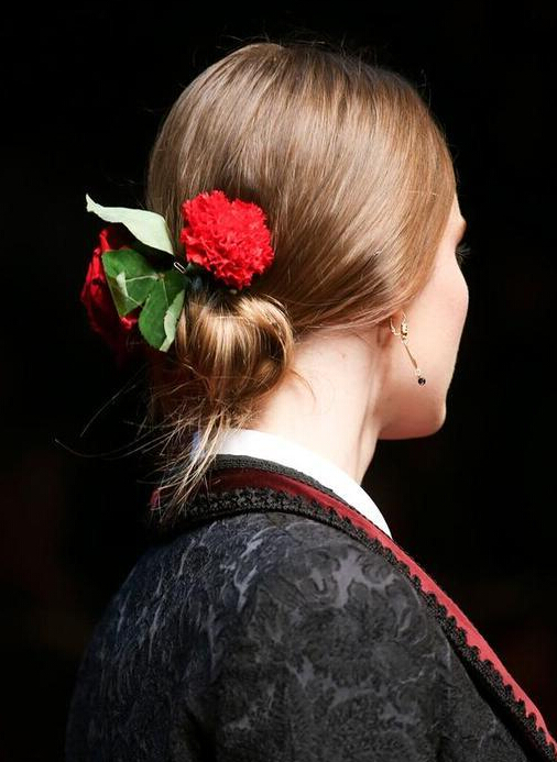 杜嘉班纳 (Dolce&Gabbana) 每一季的发型其实万变不离其宗,花样都在后边的发髻与艺术品般精美的发饰。将头发中分向后打出玫瑰花骨朵般的发髻,康乃馨与玫瑰成为了发饰的主角,拜占庭风格的皇冠也是每季必备。